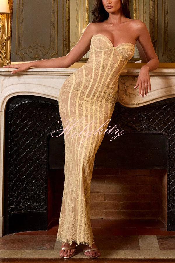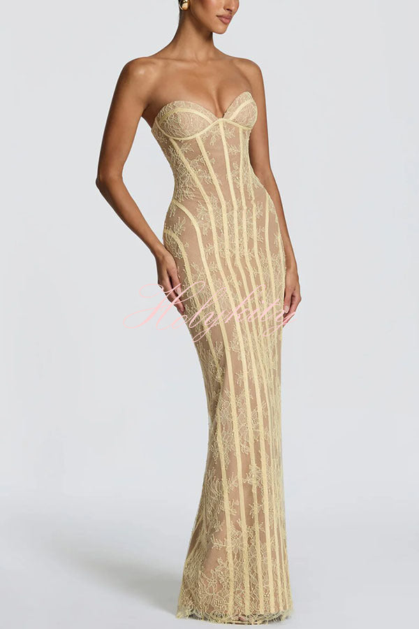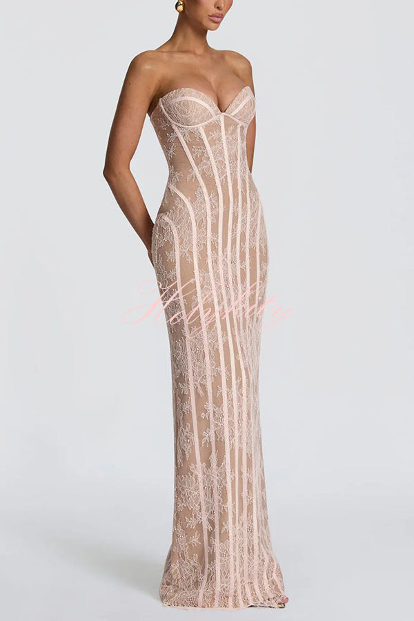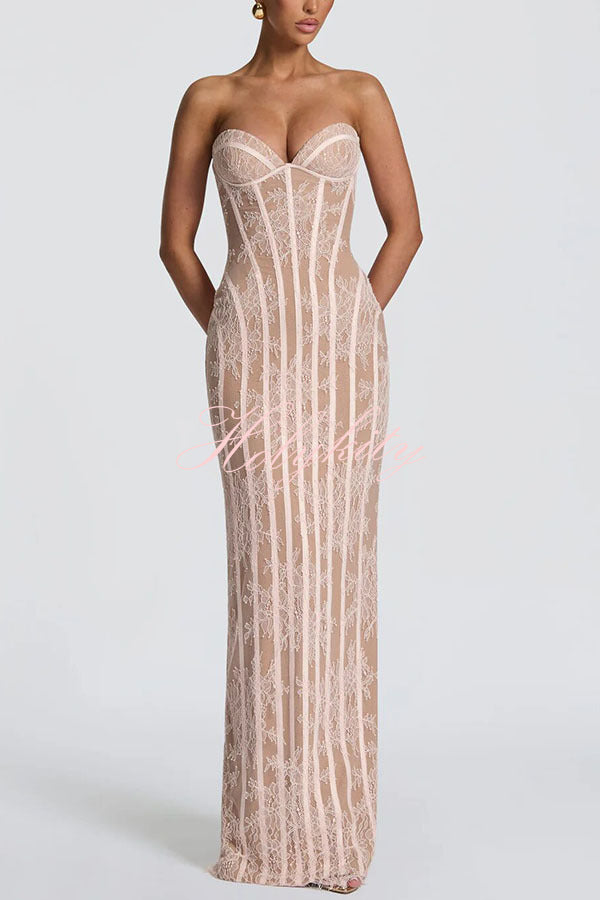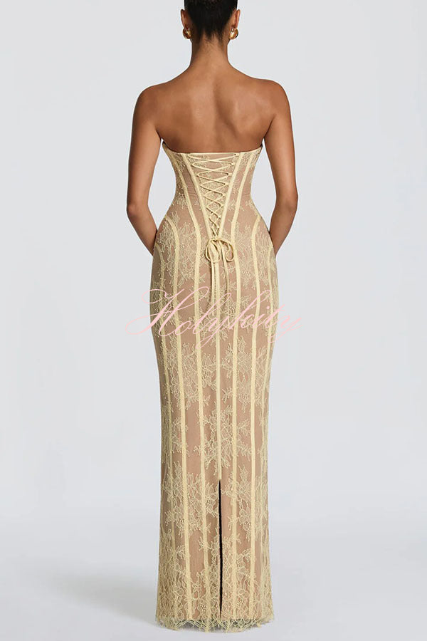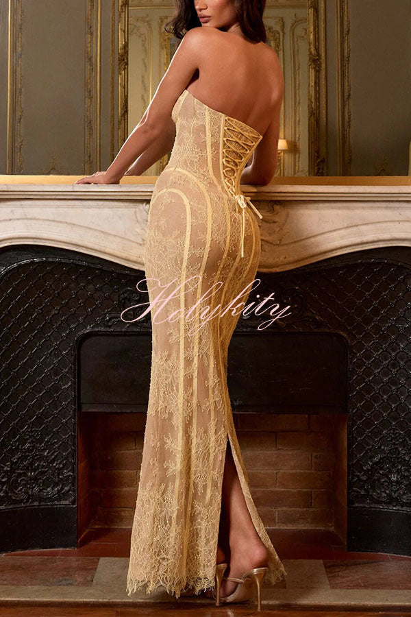 - Sian Maxi Dress in floral lace with underwired cups, shaped lace-up back, and contoured satin binding. Column silhouette features a centre back split and eyelash-trimmed hem for understated elegance. Strapless design with contrast lining and refined structural detailing.Our distinctive clothing will add instant style to your wardrobe.
