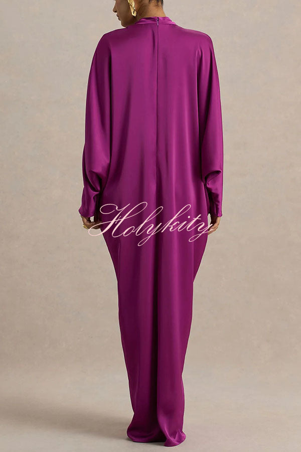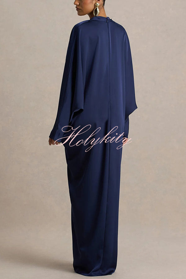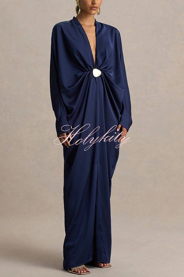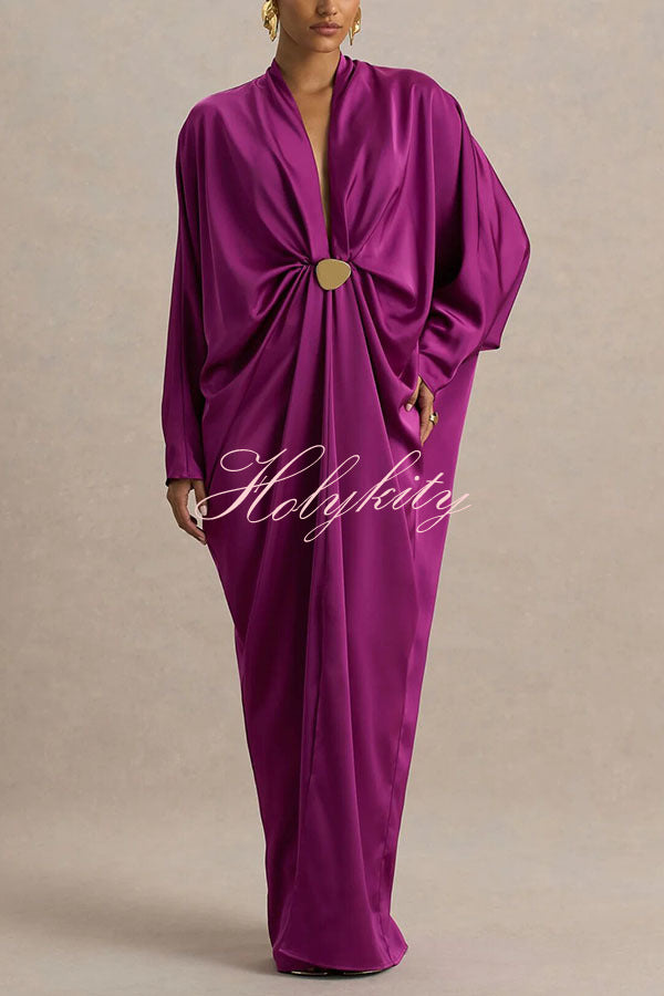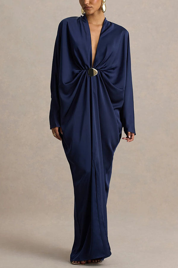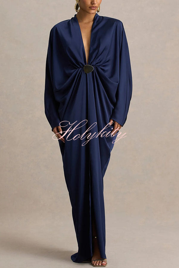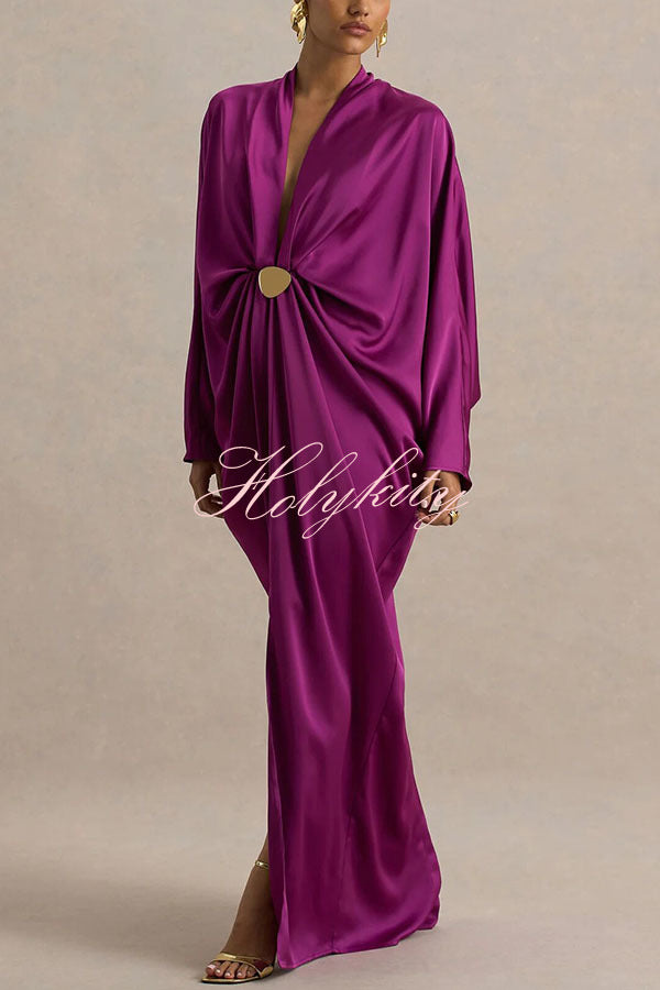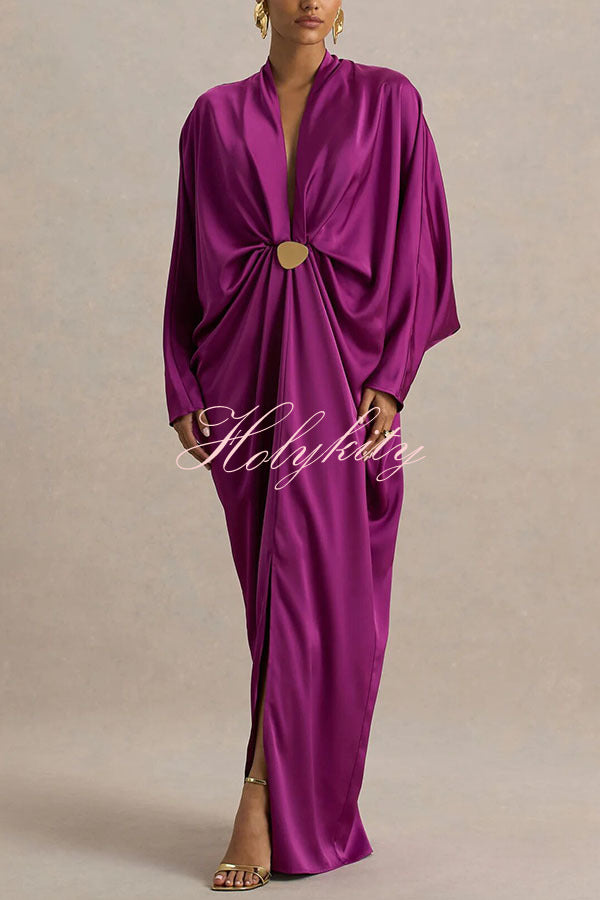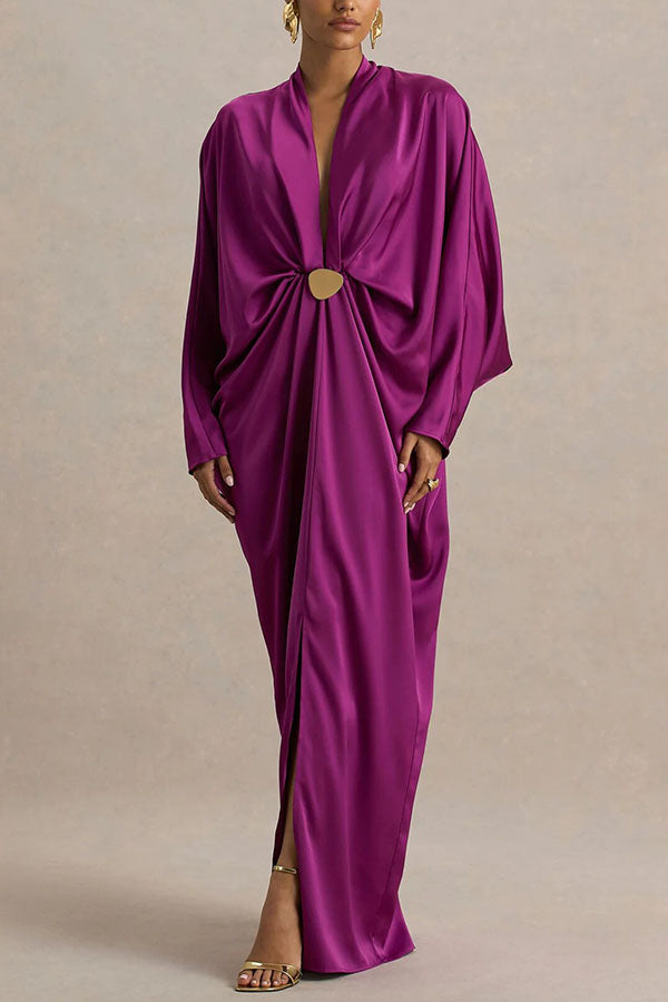 - Crafted from our premium, high-quality satin fabric, this maxi dress features a timeless design that exudes sophisticated style. The daringly deep V-neckline offers a bold, avant-garde look while retaining a sense of feminine allure, further enhanced by fluid gold-tone detailing that adds a touch of luxurious texture. The flowing, long batwing sleeves create a striking contrast with the dramatic front slit, achieving a perfect fusion of elegance and allure. Pair with exquisite high heels and gold accessories to create a truly unforgettable, show-stopping ensemble.Our distinctive clothing will add instant style to your wardrobe.