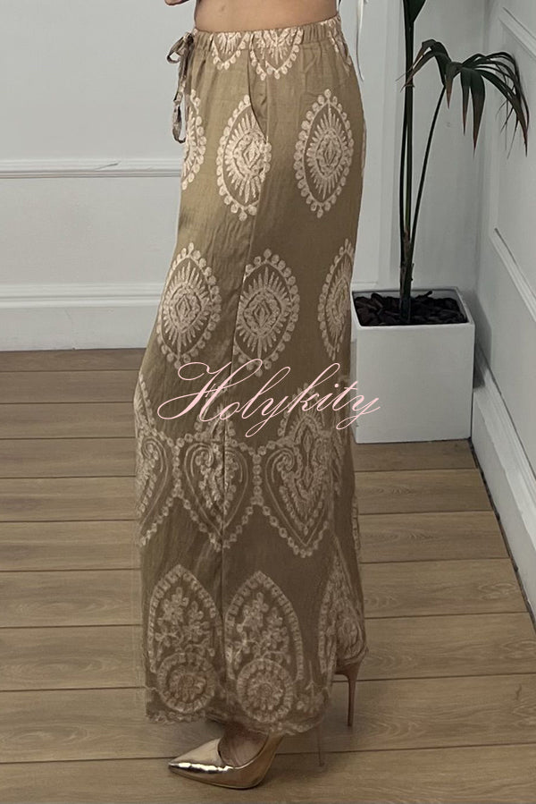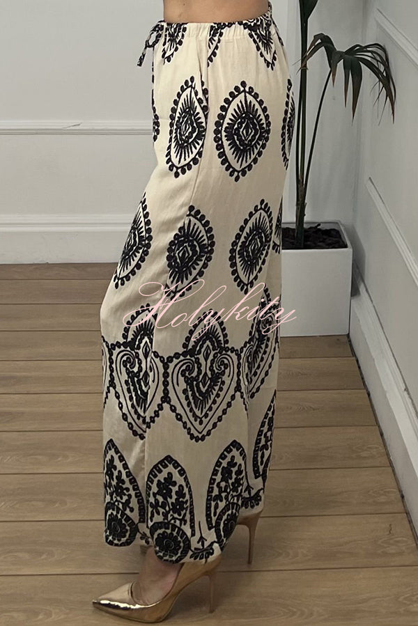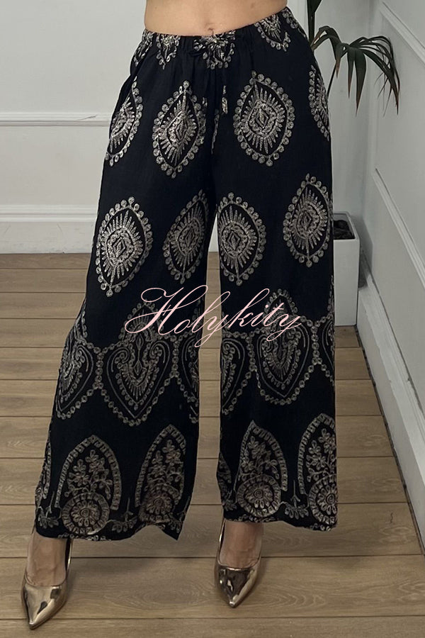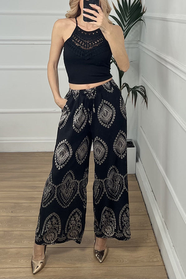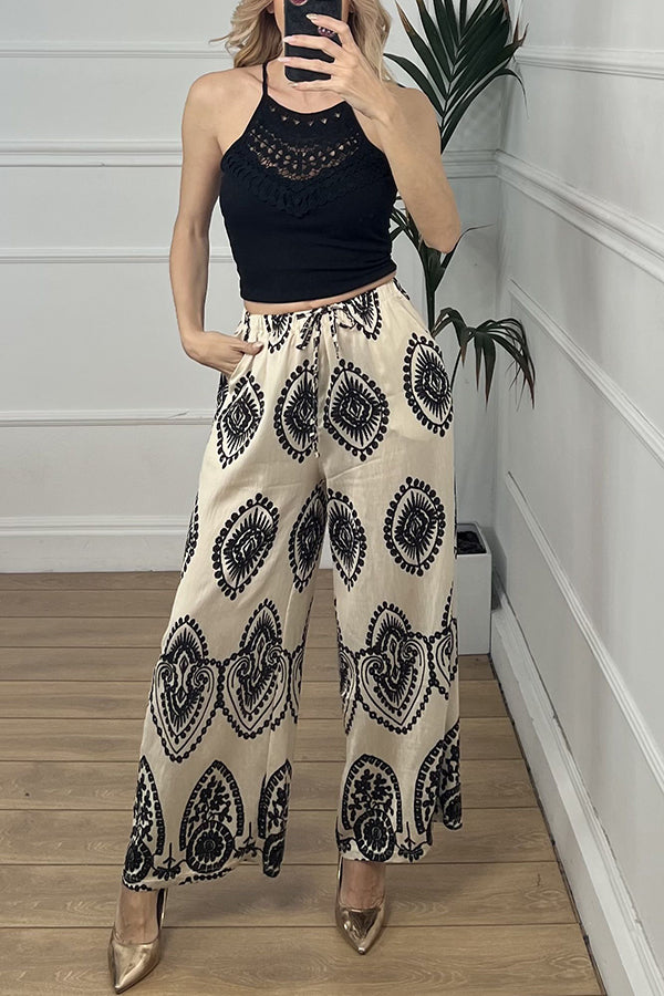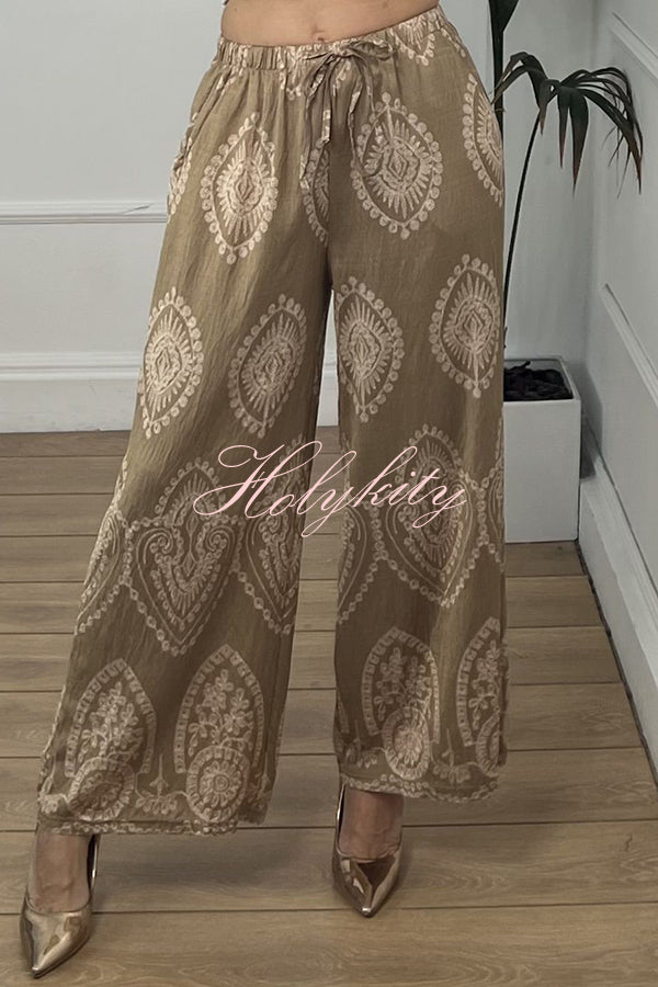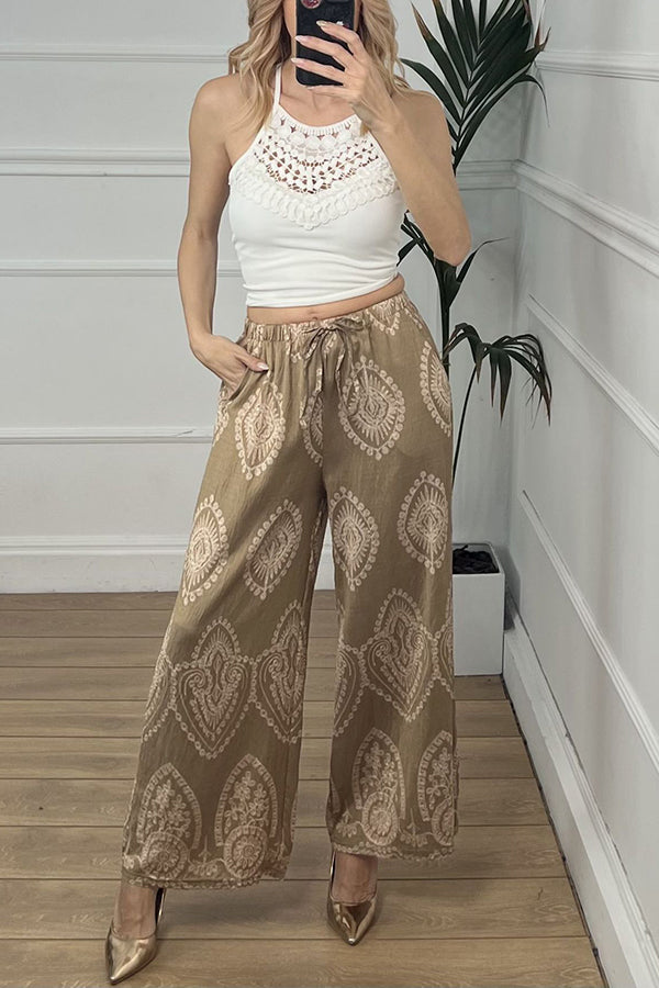 Unique Print Elastic Waist Casual Pocket Wide Leg Pants