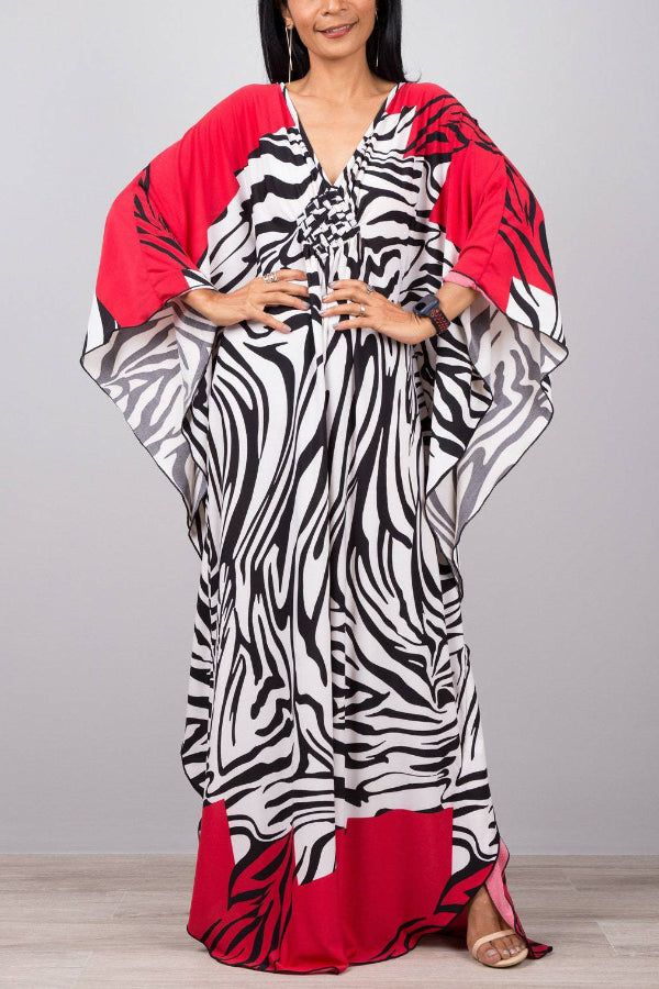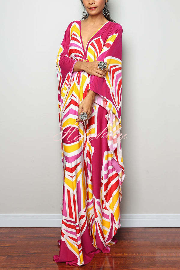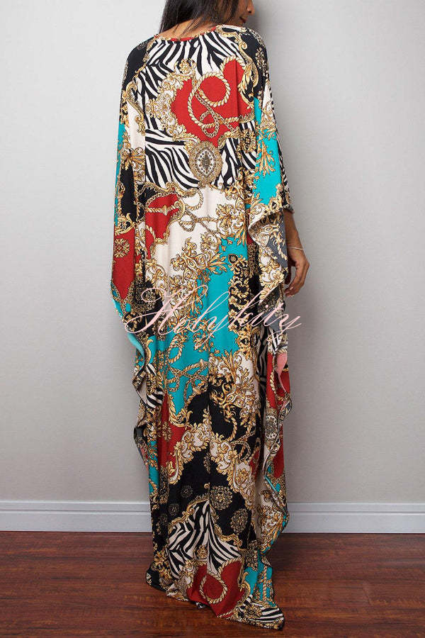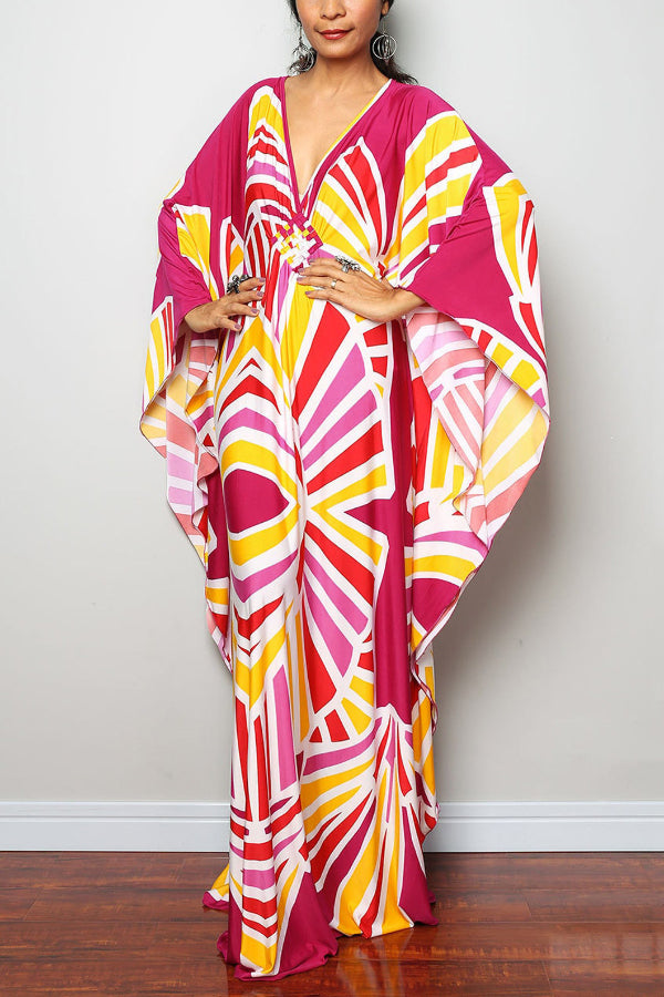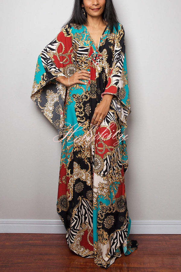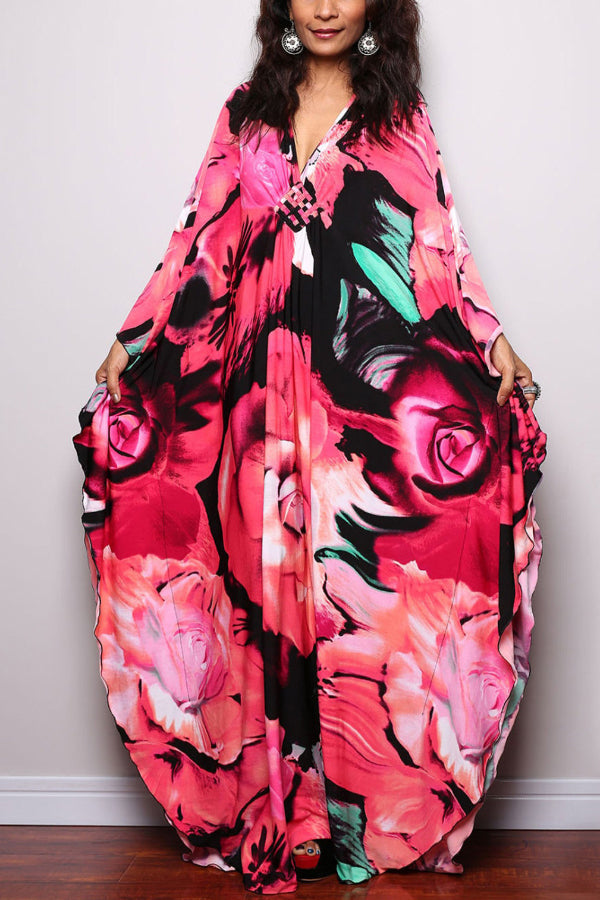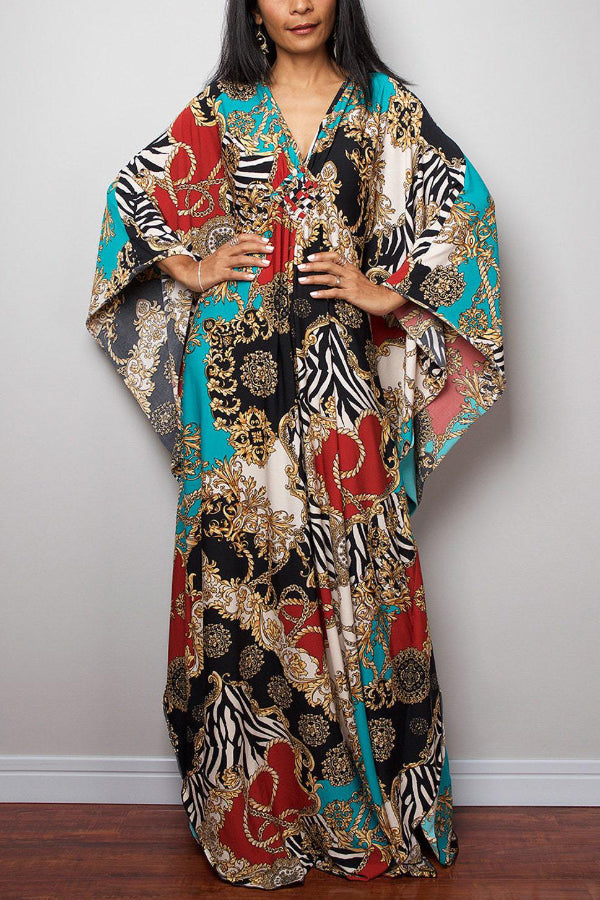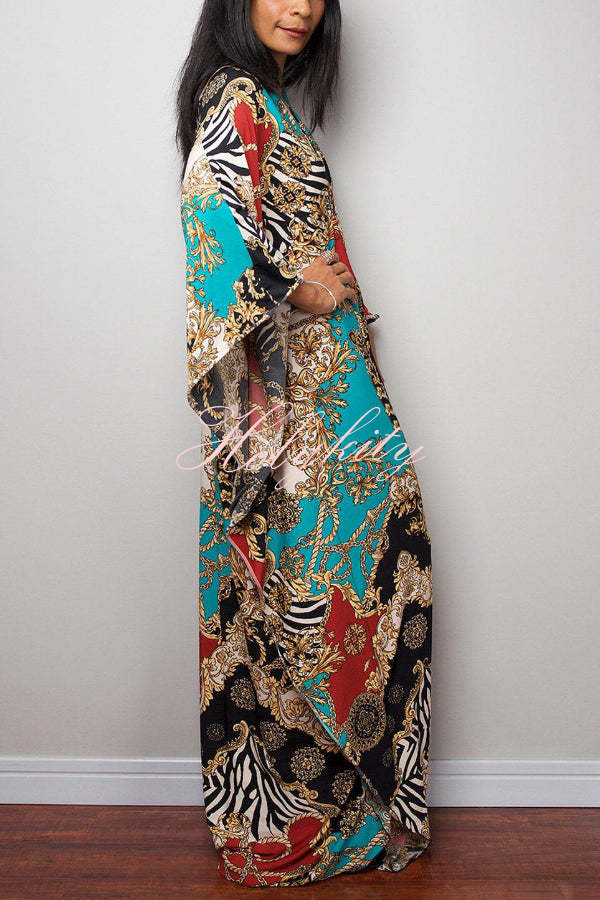 Unique Print Loose V-Neck Batwing Sleeve Casual Maxi Dress