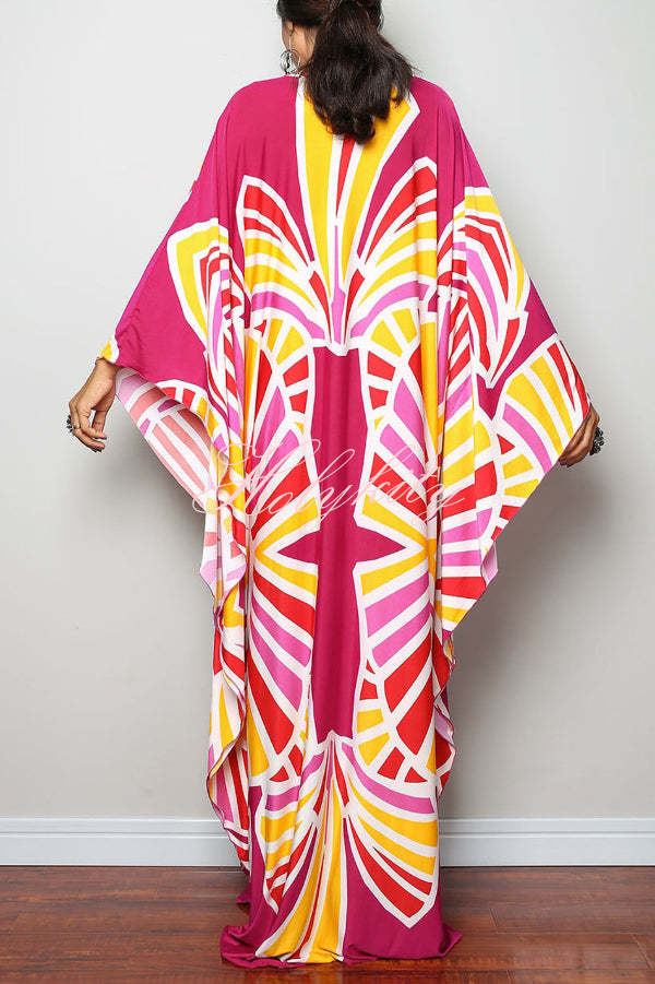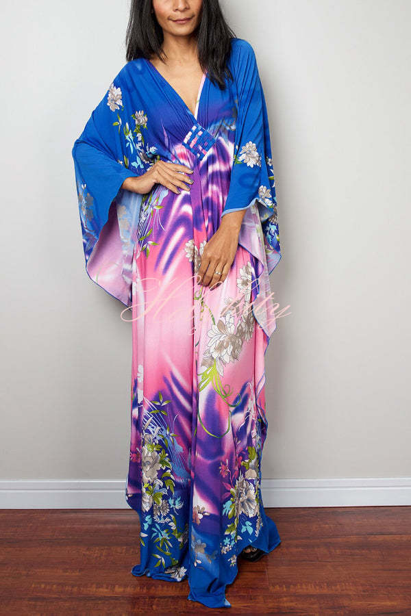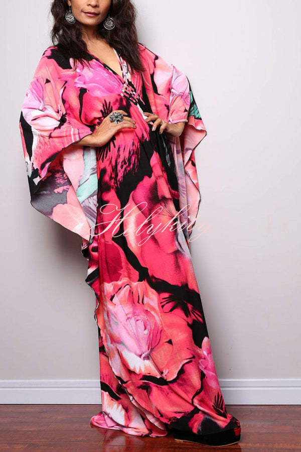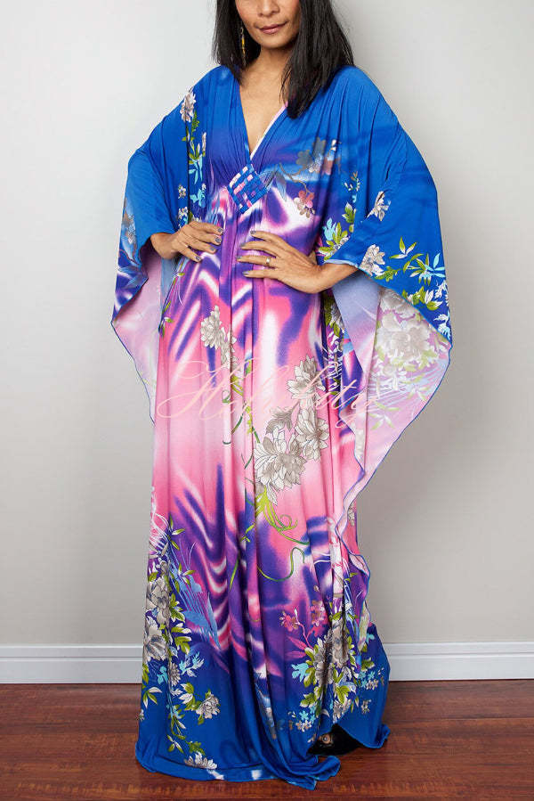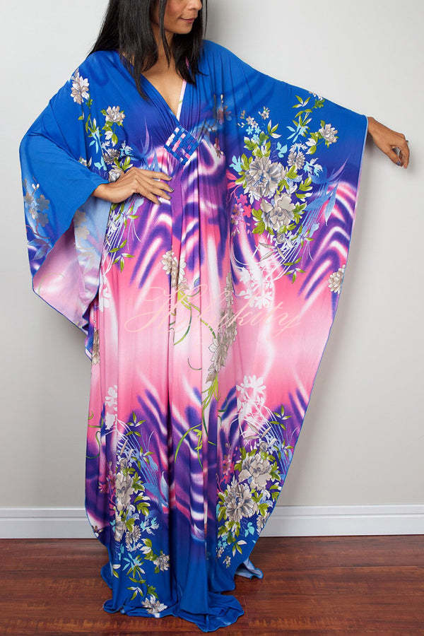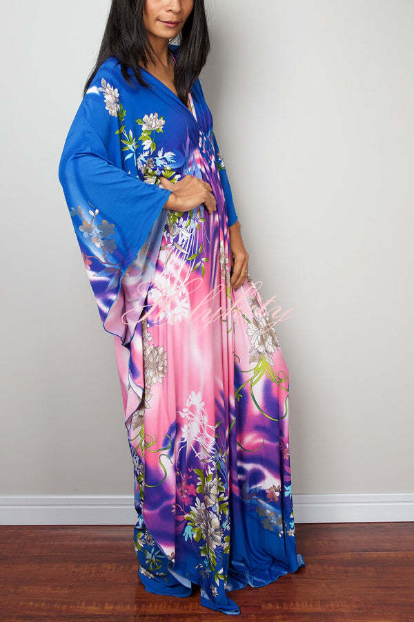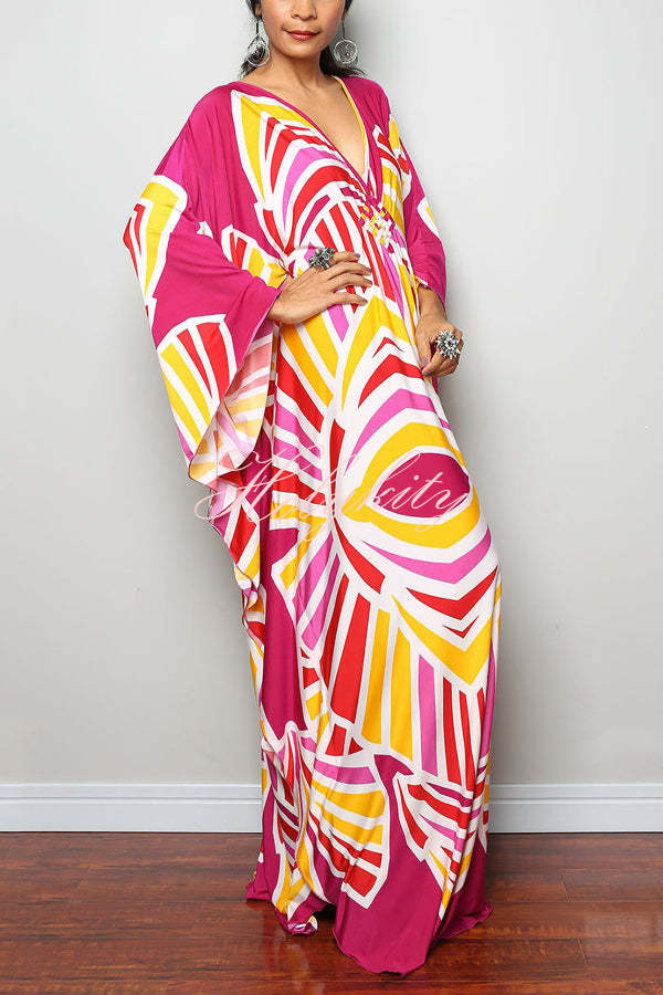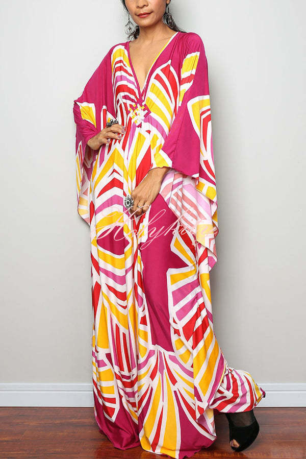 Unique Print Loose V-Neck Batwing Sleeve Casual Maxi Dress