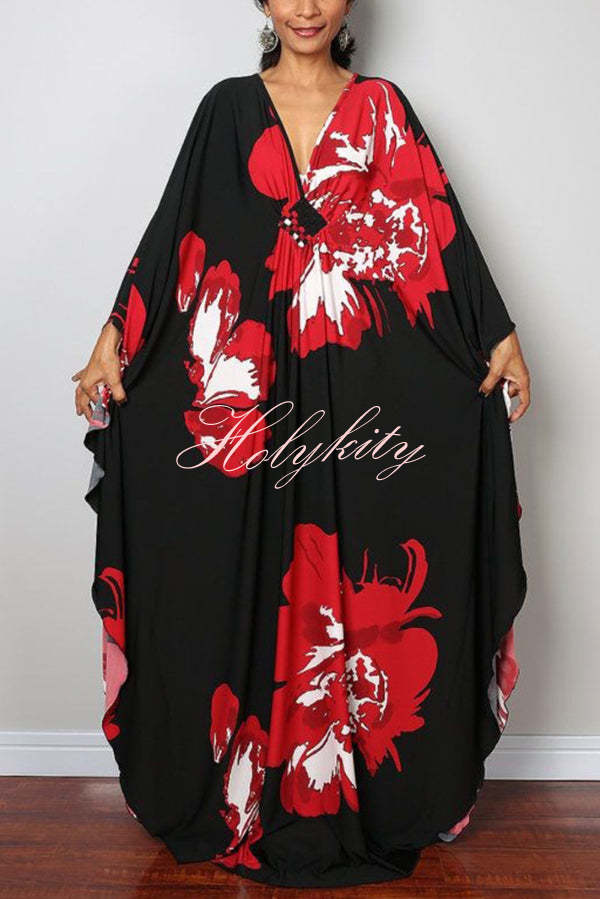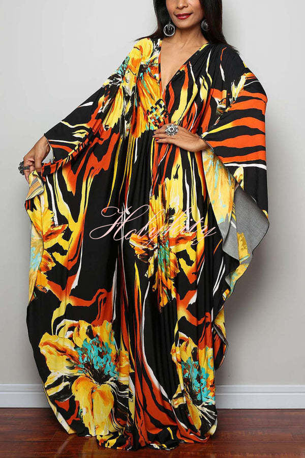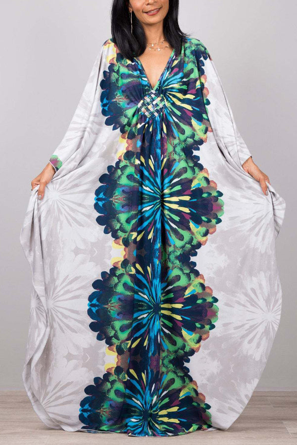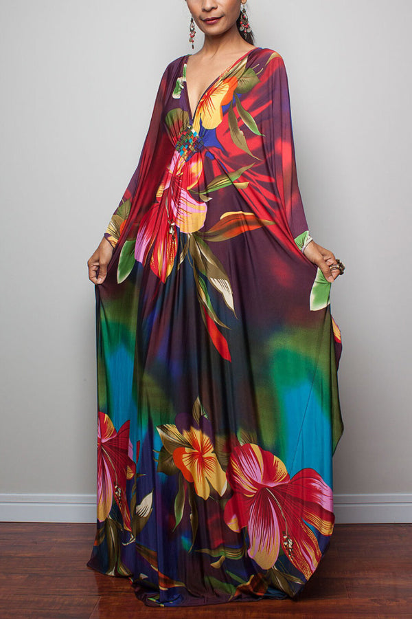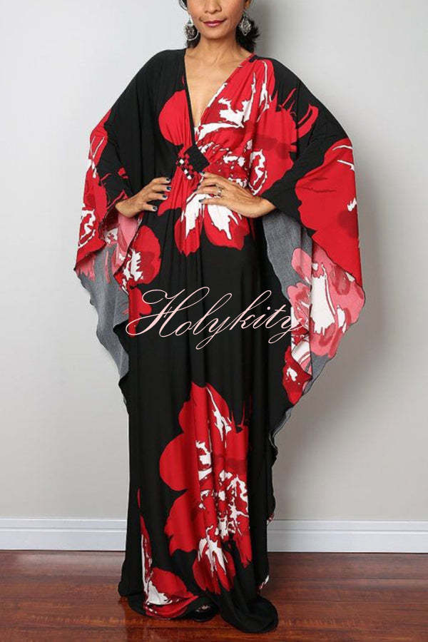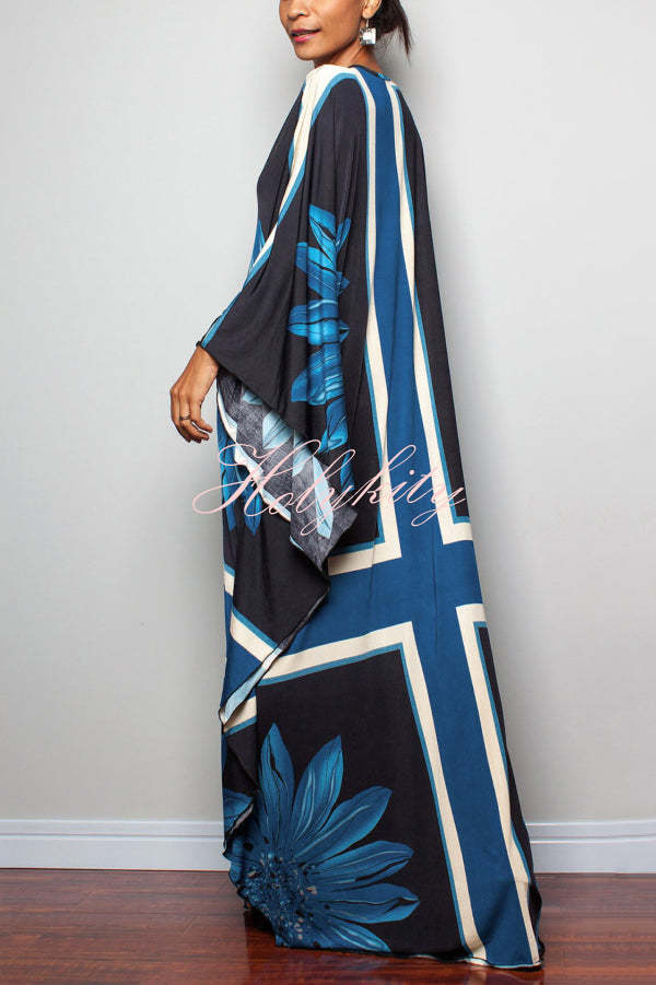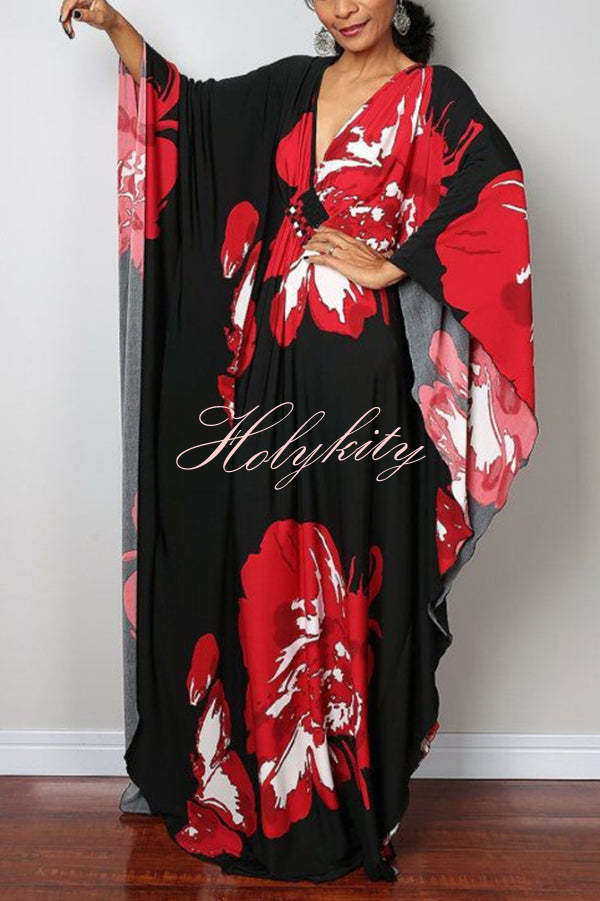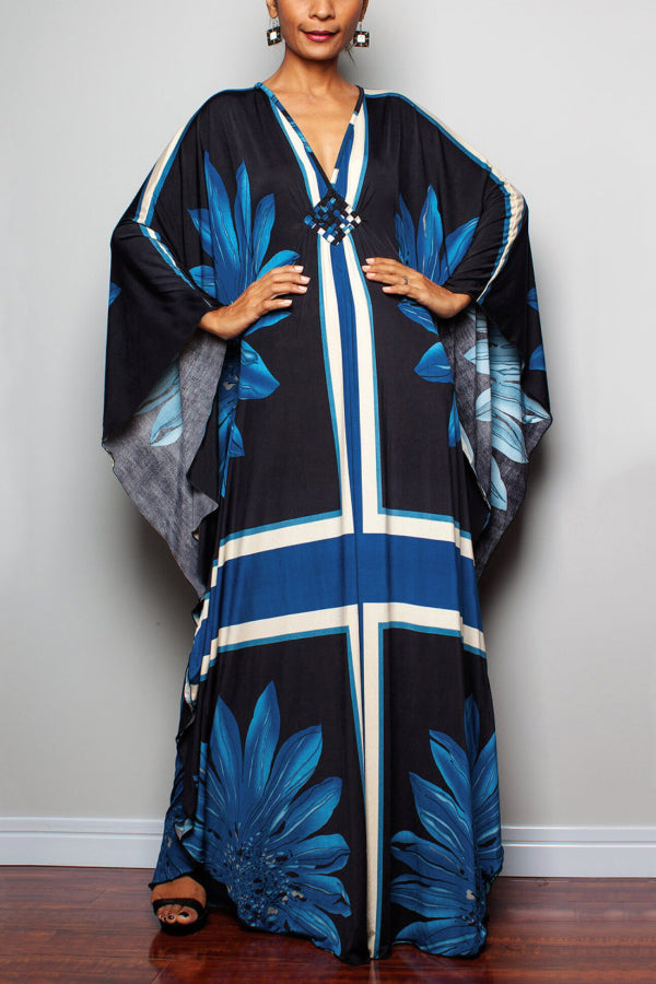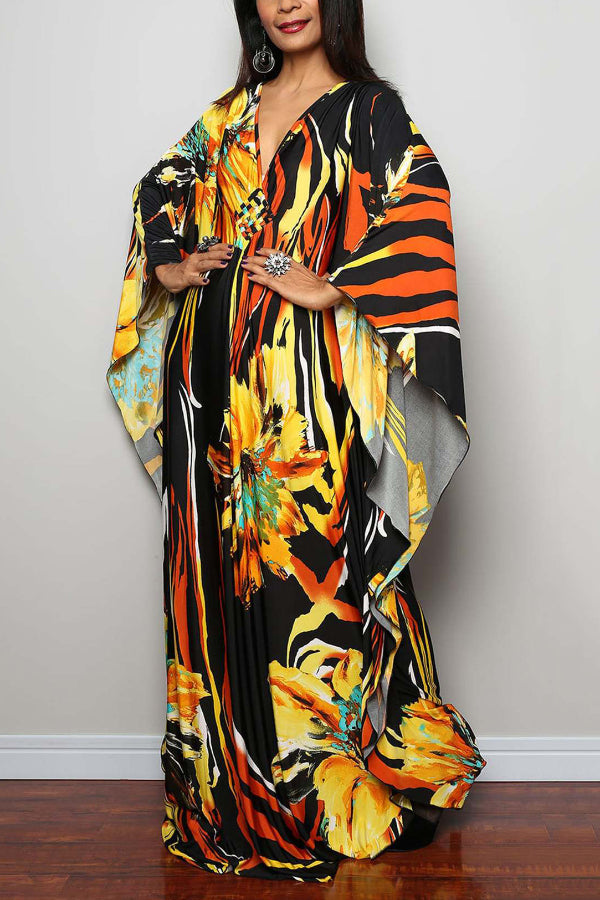 Unique Print Loose V-Neck Batwing Sleeve Casual Maxi Dress