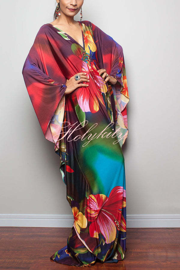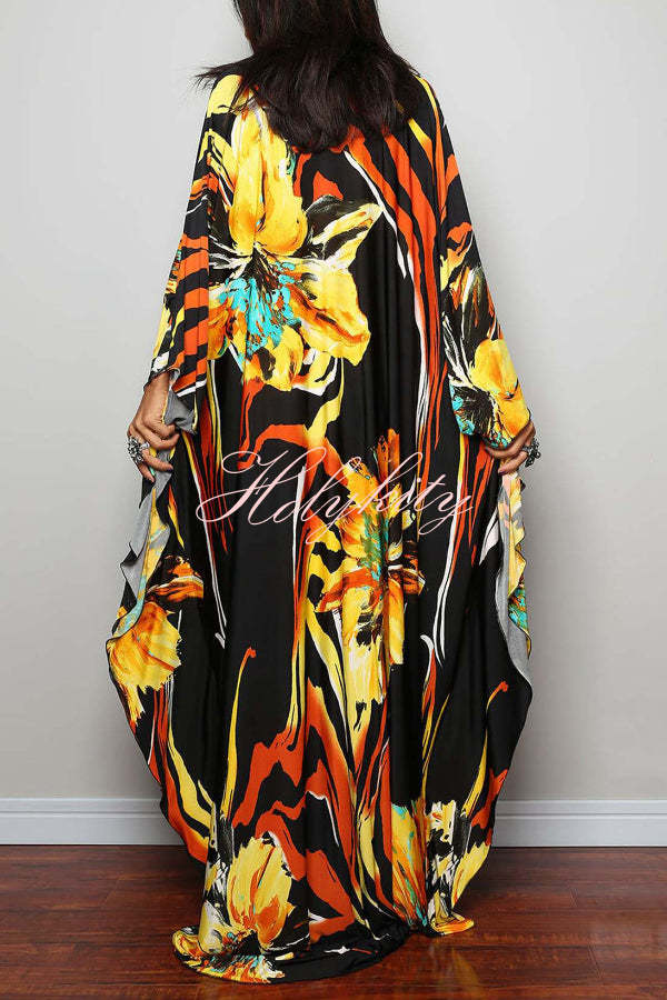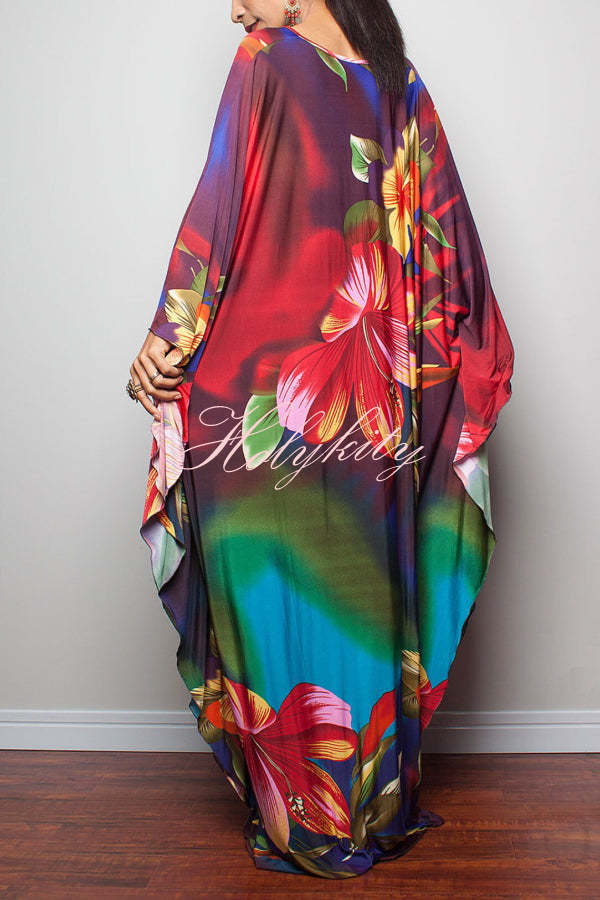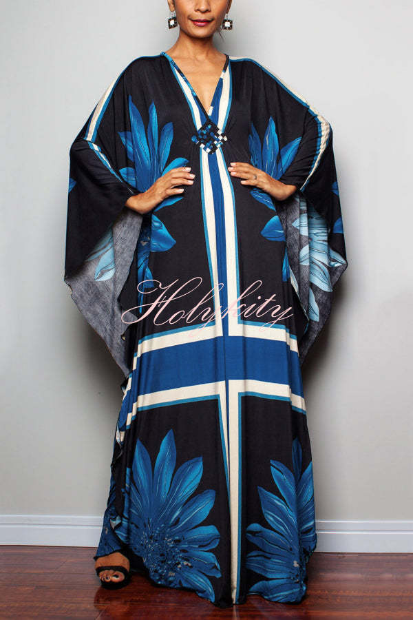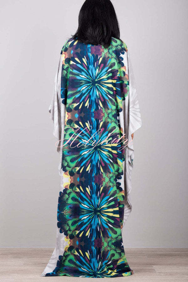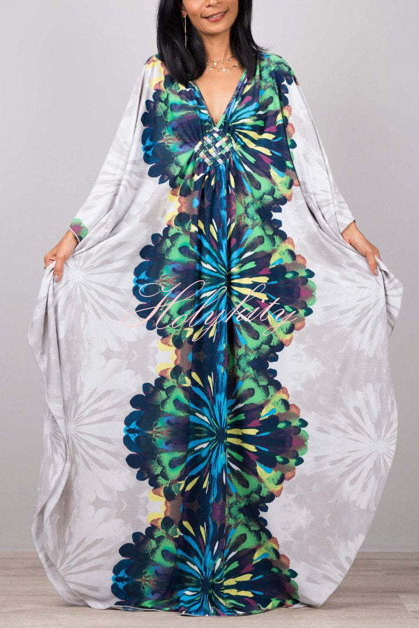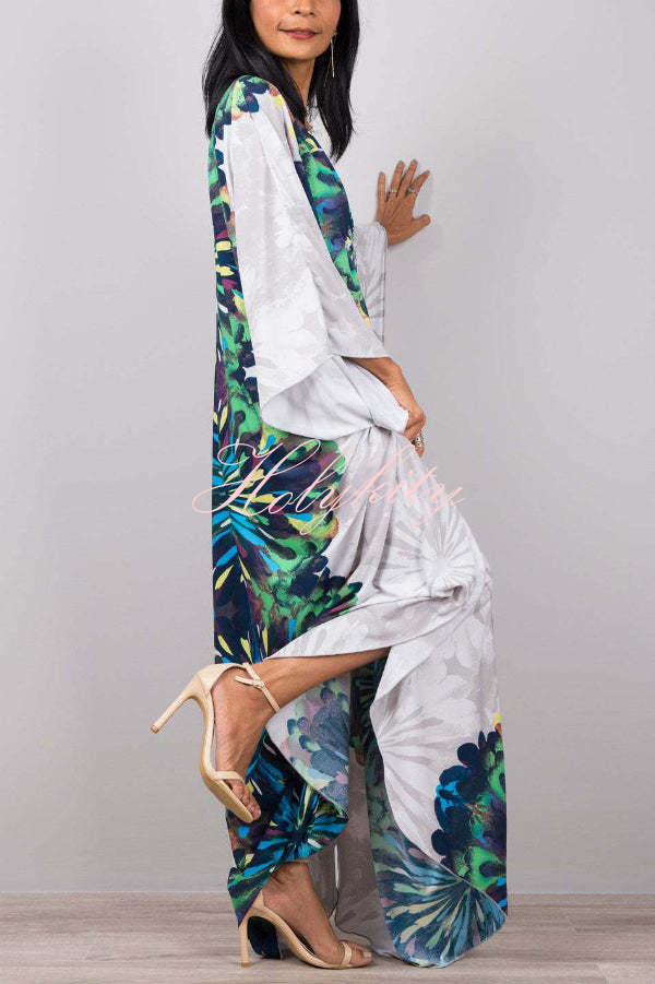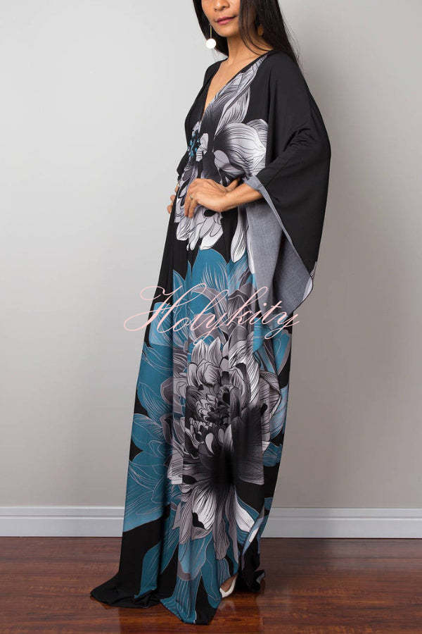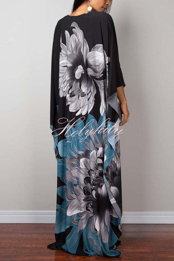 Unique Print Loose V-Neck Batwing Sleeve Casual Maxi Dress