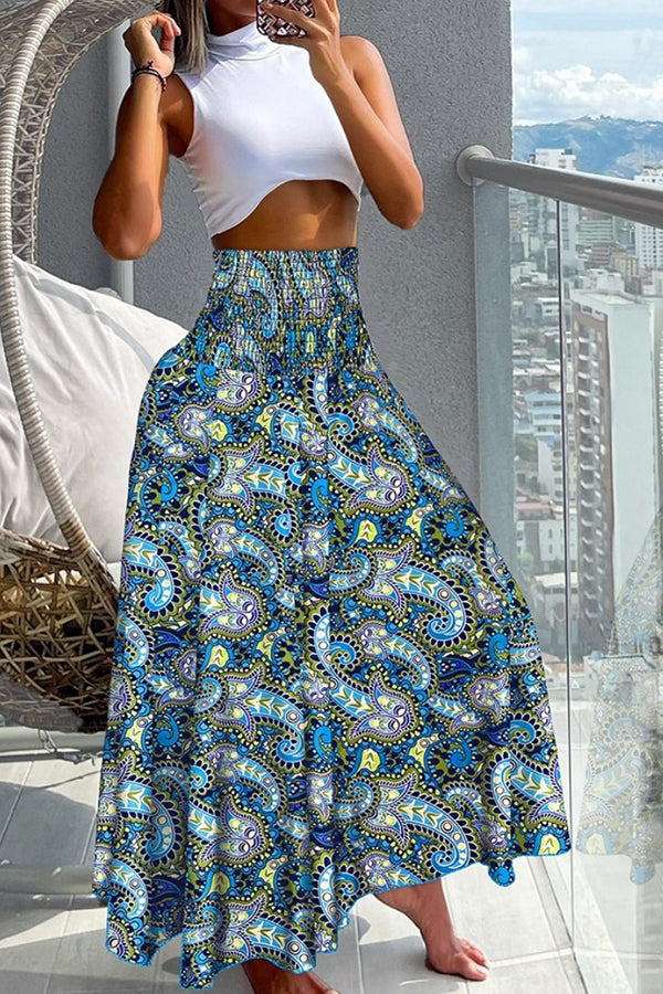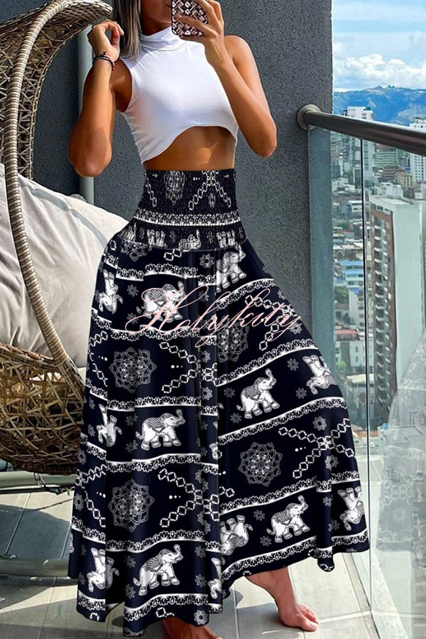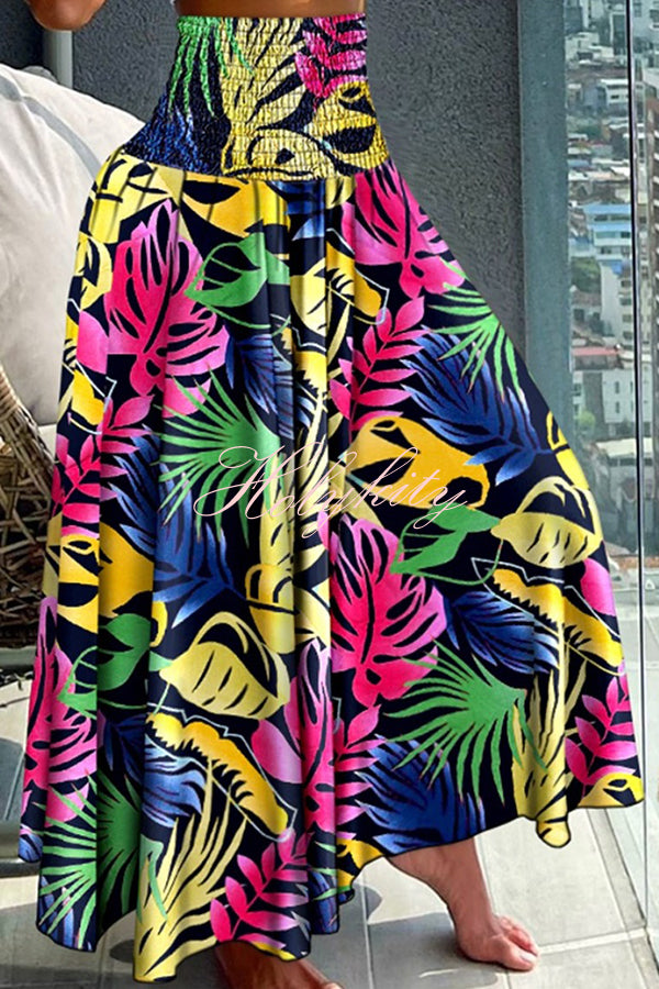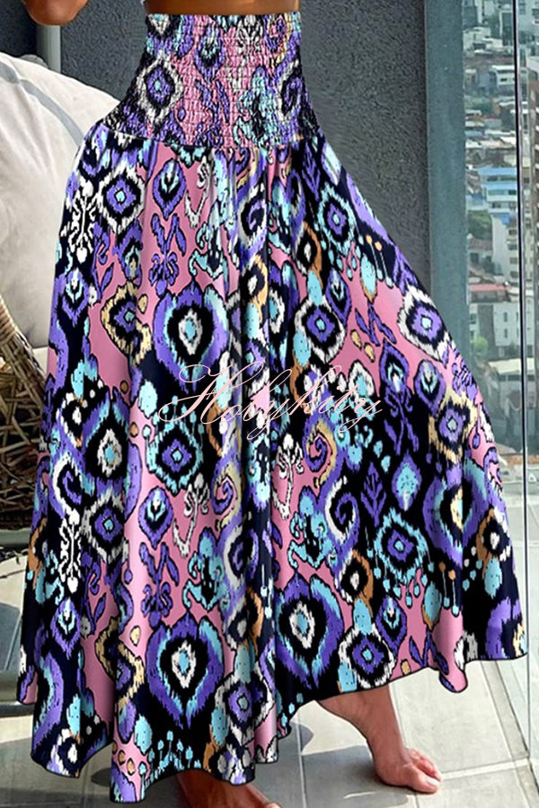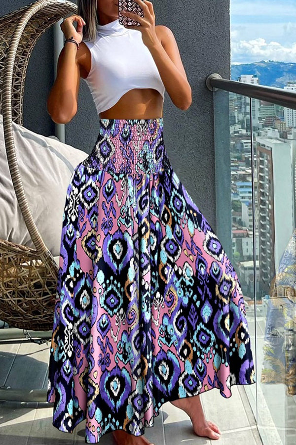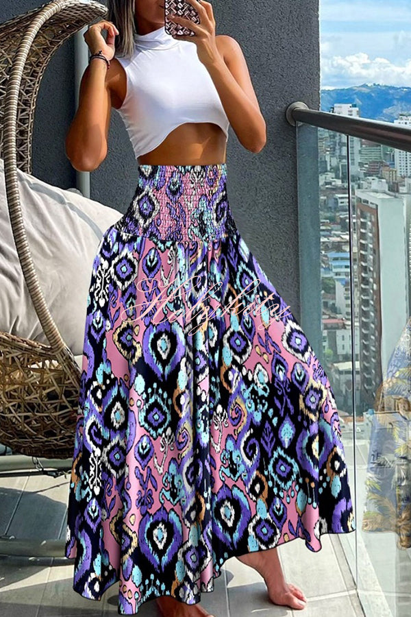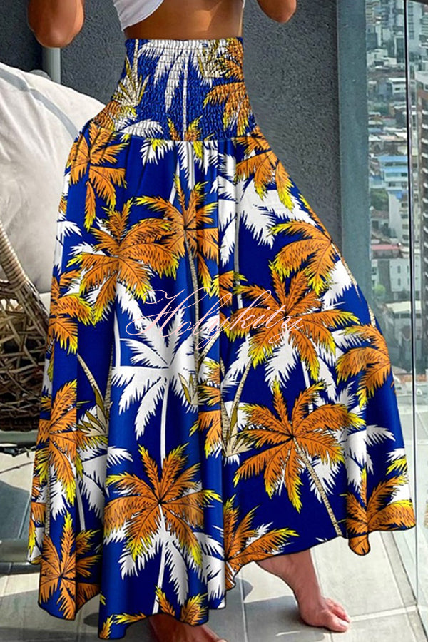 Unique Printed Pleated Elastic Waist Holiday Casual Maxi Skirt