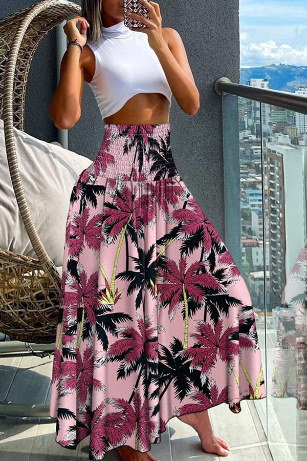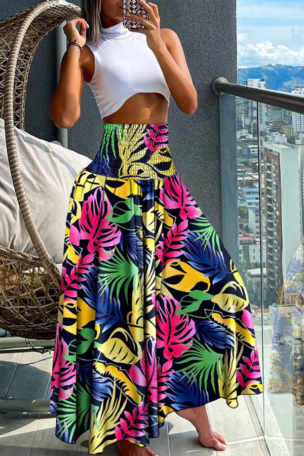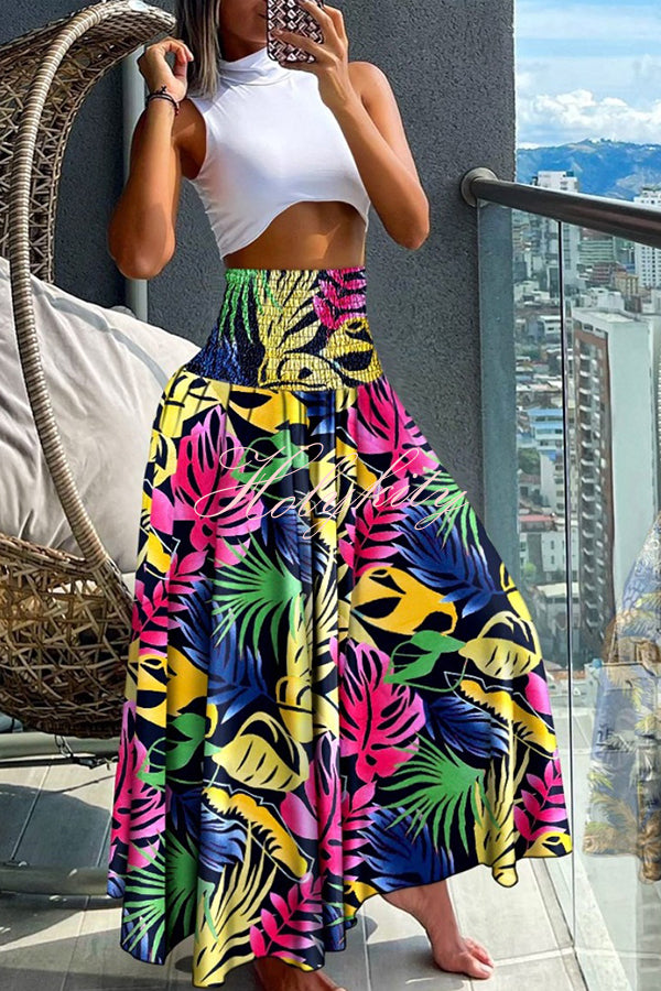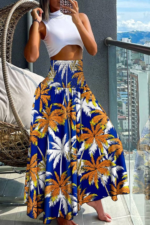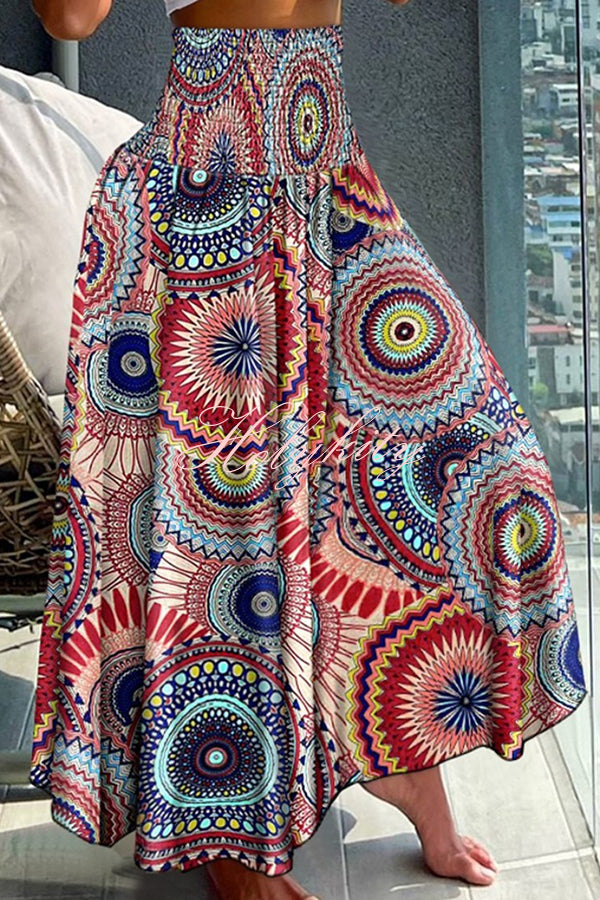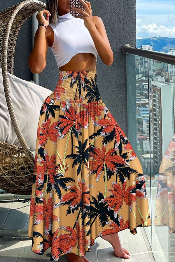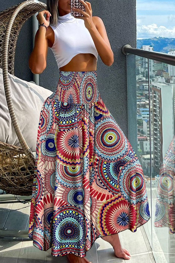 Unique Printed Pleated Elastic Waist Holiday Casual Maxi Skirt