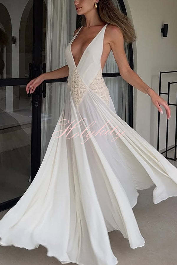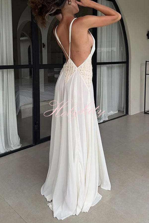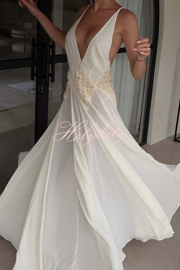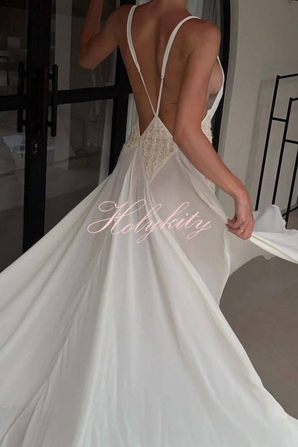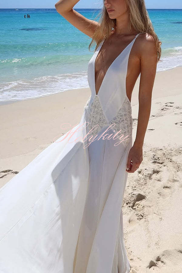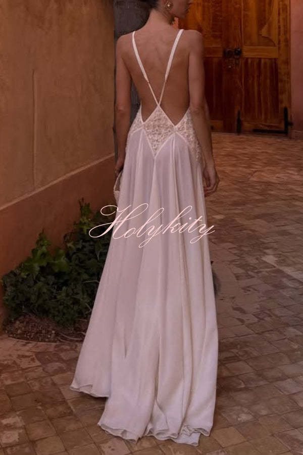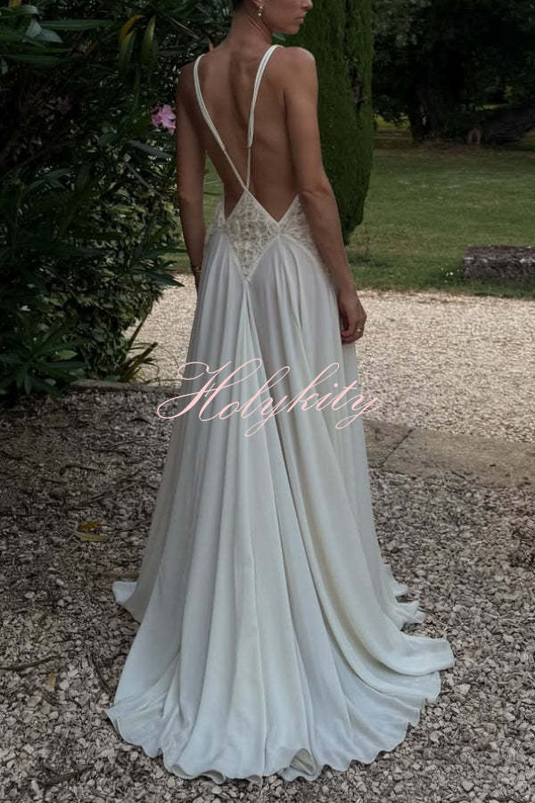 - Designed for the modern muse, it features a plunging neckline and feminine lace accents at the bodice. Adjustable straps meet at the back to create a dramatic and sexy open back. This gown blends beautifully with a soft pleated skirt for an elegant yet effortless look. Crafted in lightweight georgette that embodies freedom and fluidity; perfect for intimate celebrations or romantic getaways.