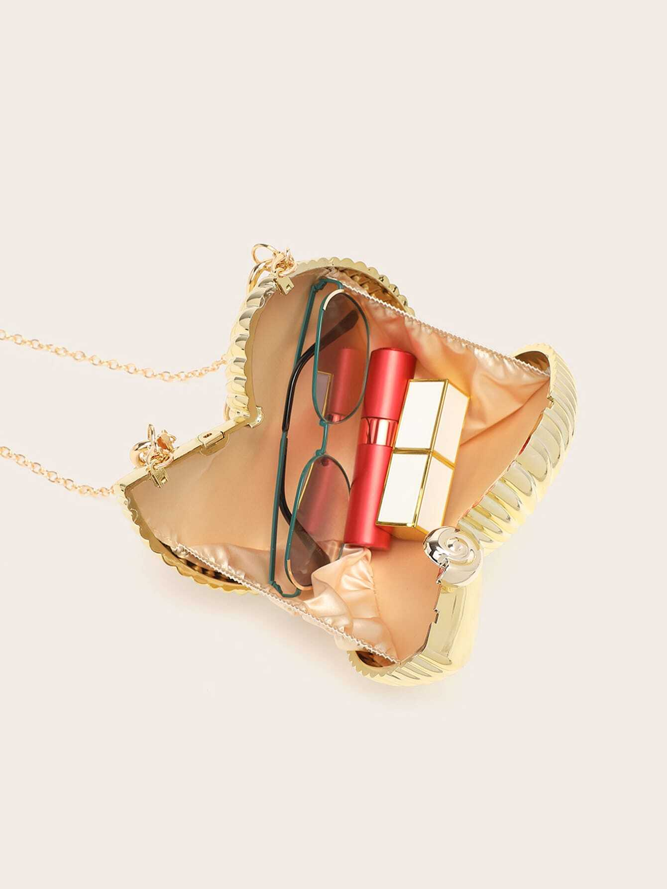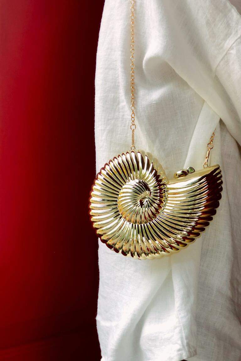 Take inspo from the ocean with this conch shell-shaped resin clutch. Featuring metal plating exterior, as well as black fabric interior and lock closure. Also includes 120cm detachable gold metal shoulder chain. Wear it as a clutch or crossbody!