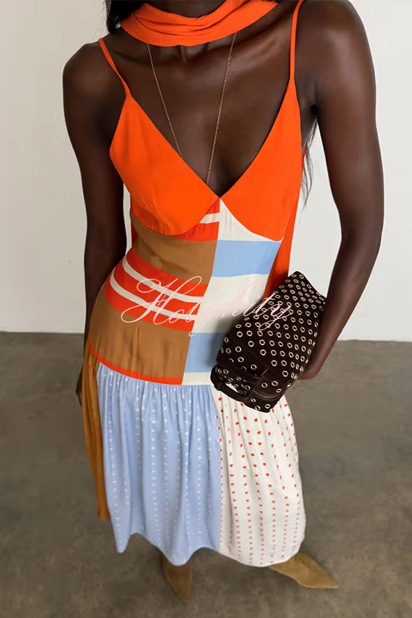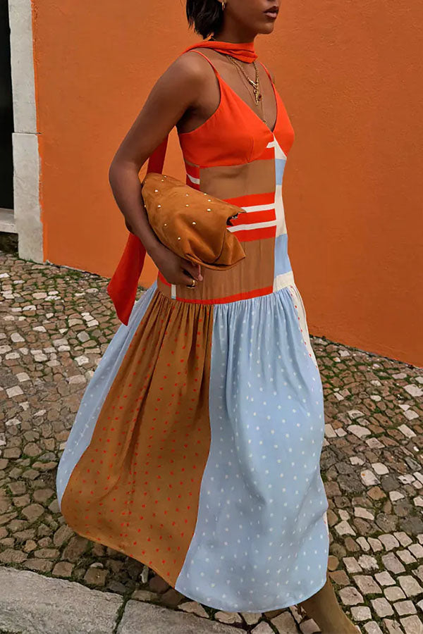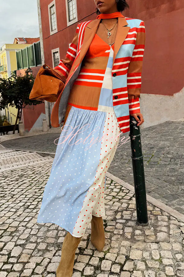 - This dress will definitely add a pop of color to your wardrobe! The stylish orange and blue color scheme makes it an office essential. The slightly fitted cut, paired with a flowing pleated skirt, exudes elegance. The clever integration of checkered and polka dot patterns adds a touch of playfulness to the simple silhouette!Our distinctive clothing will add instant style to your wardrobe.